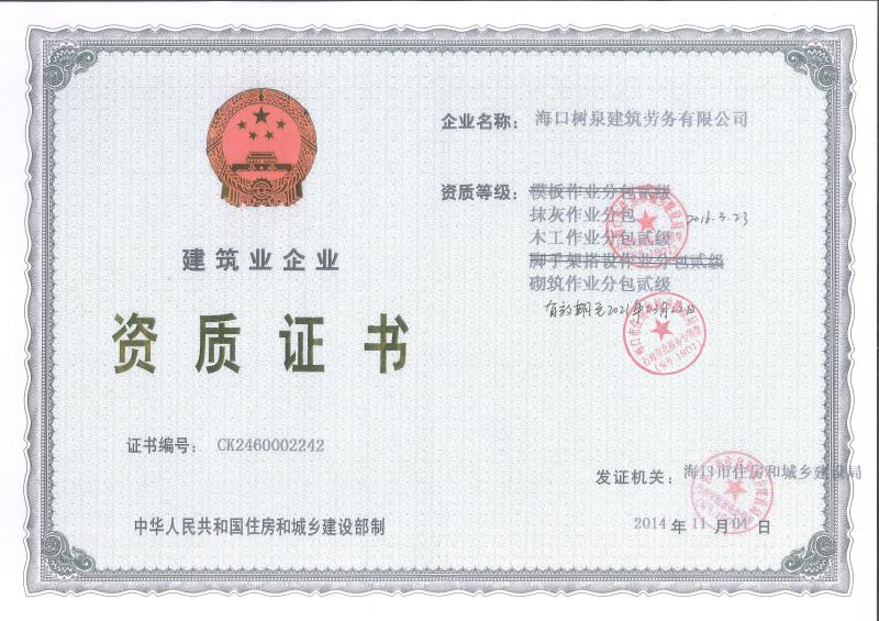 海口樹泉建筑勞務(wù)有限公司成立于2011年,公司位于海口,其前身是一家專業(yè)建筑施工隊(duì),自2004年即開始在海南從事建筑勞務(wù)施工。自成立至今,公司已經(jīng)擁有一支科學(xué)管理、質(zhì)量過(guò)硬、能打硬仗,搶工期的專業(yè)隊(duì)伍。能獨(dú)立承擔(dān)大中型工業(yè)與民用建筑 、室內(nèi)外裝修、各類機(jī)電設(shè)備安裝工程。代表工程有海口濱海華庭、三亞時(shí)代海岸T01/02/04/05棟高層、合肥東海花園二期、陵水富力灣B區(qū)高層、三亞金中海(酒店)、瓊海大印經(jīng)典花園、海口環(huán)球海景大酒店(四星級(jí)酒店,在建中)、陵水珍珠大廈(五星酒店)、海口萬(wàn)達(dá)廣場(chǎng)、美蘭機(jī)場(chǎng)二期。